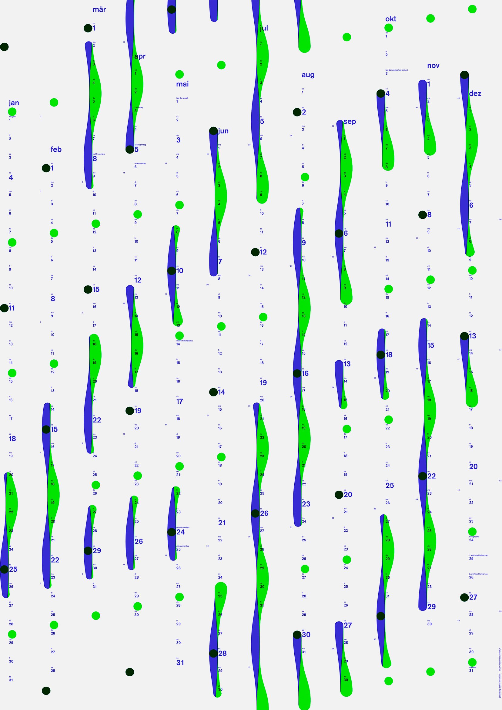 calendar 2026 / german, with berlin holidays / din a0 / 84,1 × 118,9 cm / 2-colour-silkscreen neon green and blue / printed by kees maas on high quality 150g paper / design by daniel wiesmann